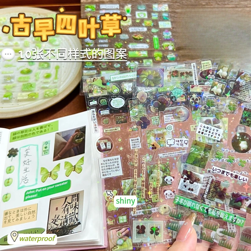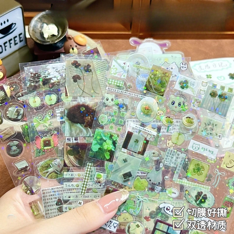 10Pcs Japanese Retro Green Transparent Cut Film Stickers Cute DIY decor for Scrapbooking Journals Laser Star Phone Case Decals