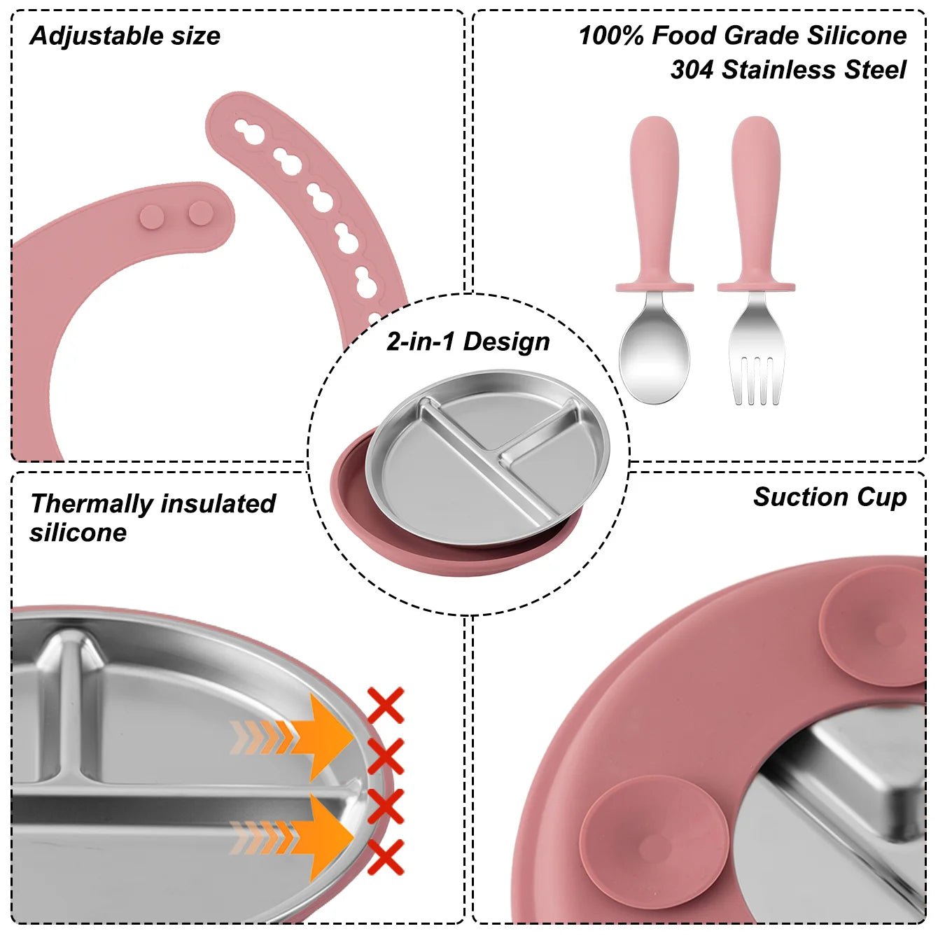 This thoughtfully designed feeding set makes mealtime safe and enjoyable. The stainless steel construction ensures durability, while the silicone components are gentle on gums and teeth, creating the perfect combination for babies learning to eat independently with confidence and safety.