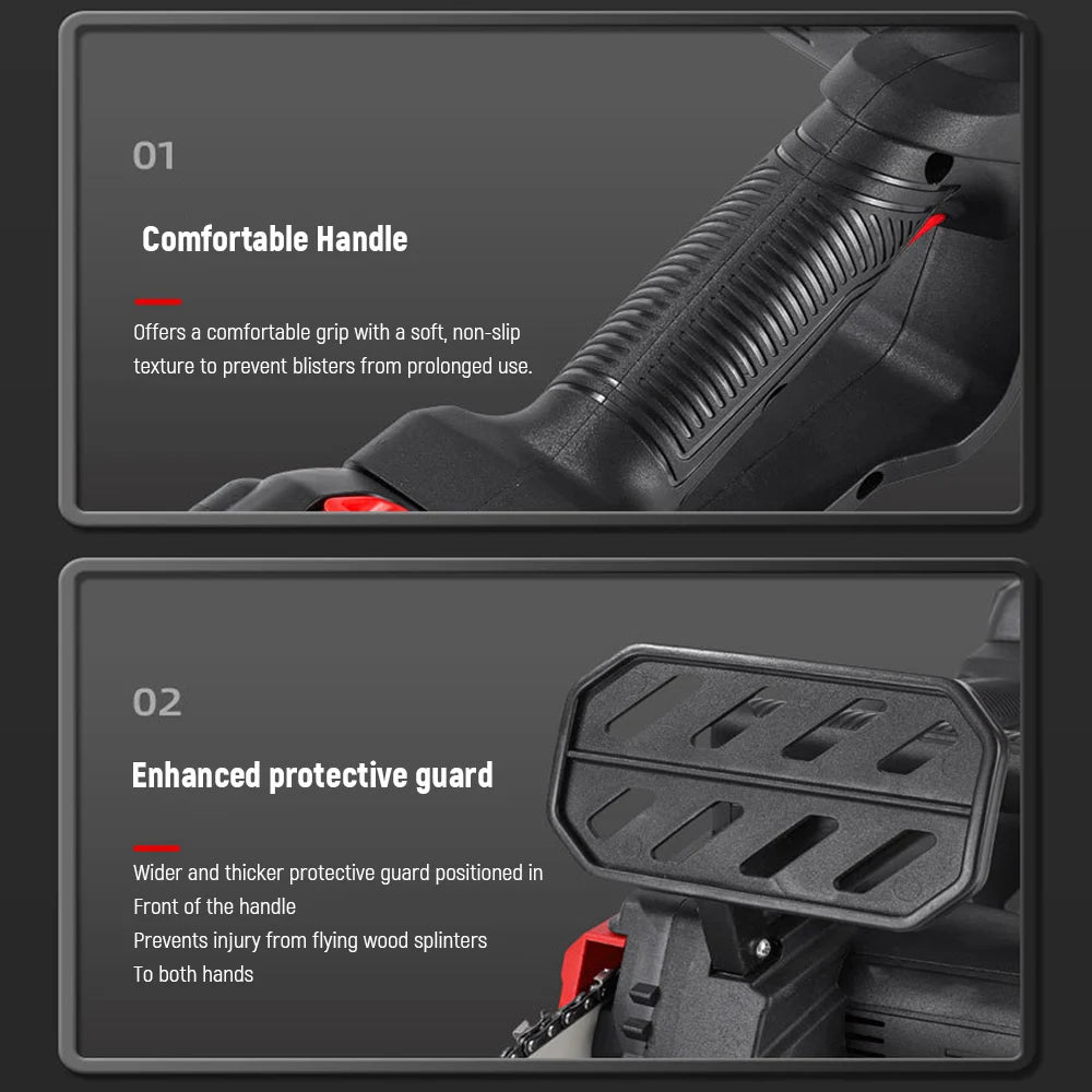 Experience the power and convenience of our brushless cordless electric chainsaw, designed for both professional landscapers and DIY enthusiasts. Available in 12-inch and 16-inch bar lengths, this rechargeable chainsaw delivers exceptional cutting performance without the hassle of cords or gas.