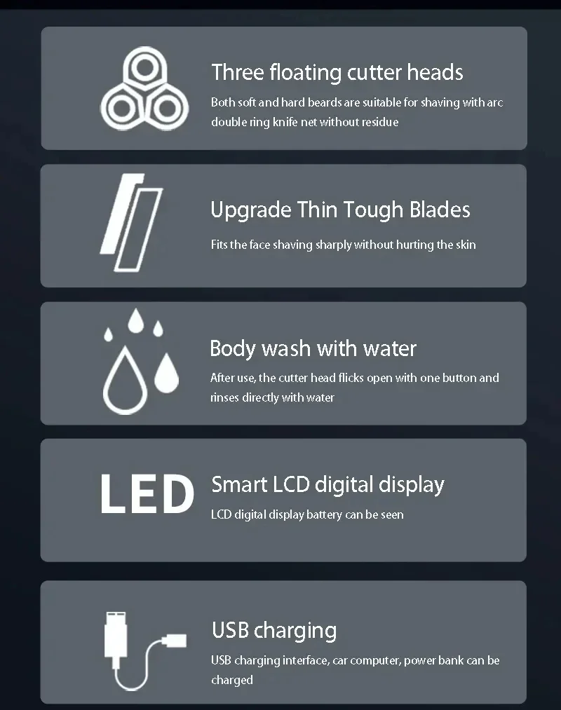 2. Function: Full body wash, LED display, floating blade, face adjustment, other